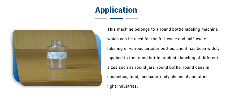 تنتمي هذه الآلة إلى آلة وسم الزجاجات الدائرية والتي يمكن استخدامها لوضع العلامات على الدورة الكاملة ونصف الدورة للعديد من الزجاجات الدائرية ، وقد تم تطبيقها على نطاق واسع على وضع علامات على منتجات الزجاجة الدائرية ذات الأحجام المختلفة مثل الجرار المستديرة ، الزجاجة المستديرة ، علب مستديرة في مستحضرات التجميل ، الغذاء ، الطب ، الصناعات الكيماوية اليومية وغيرها من الصناعات الخفيفة. تكوين المعدات: خزانة كهربائية ، آلية نقل ، جهاز زجاجة منفصل ، جهاز تسمية رولينج ، جهاز تسمية الفرشاة ، محرك وسم 1 # ، نظام تشغيل ونظام تحكم.
